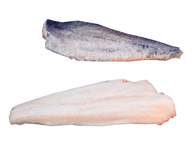 Filete de merluza austral, sin espinas con piel por un lado, peso variable, entre 900 grs y 1,8 kilos.